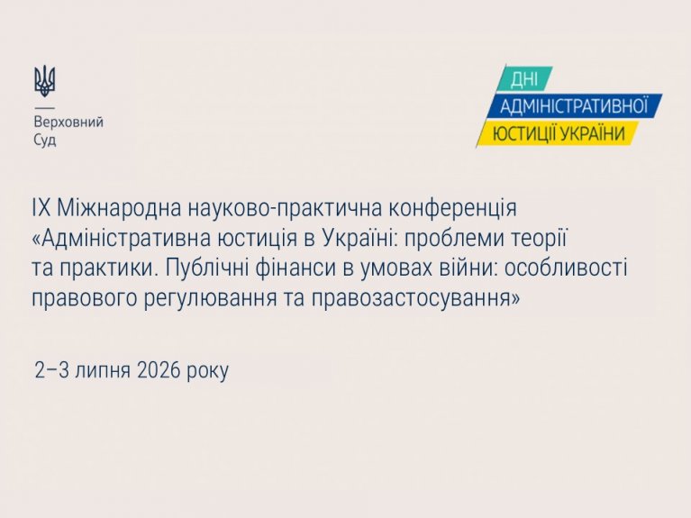 Касаційний адміністративний суд у складі Верховного Суду 2–3 липня 2026 року організовує ІХ Міжнародну науково-практичну конференцію «Адміністративна юстиція в Україні: проблеми теорії та практики. Публічні фінанси в умовах війни: особливості правового регулювання та правозастосування».